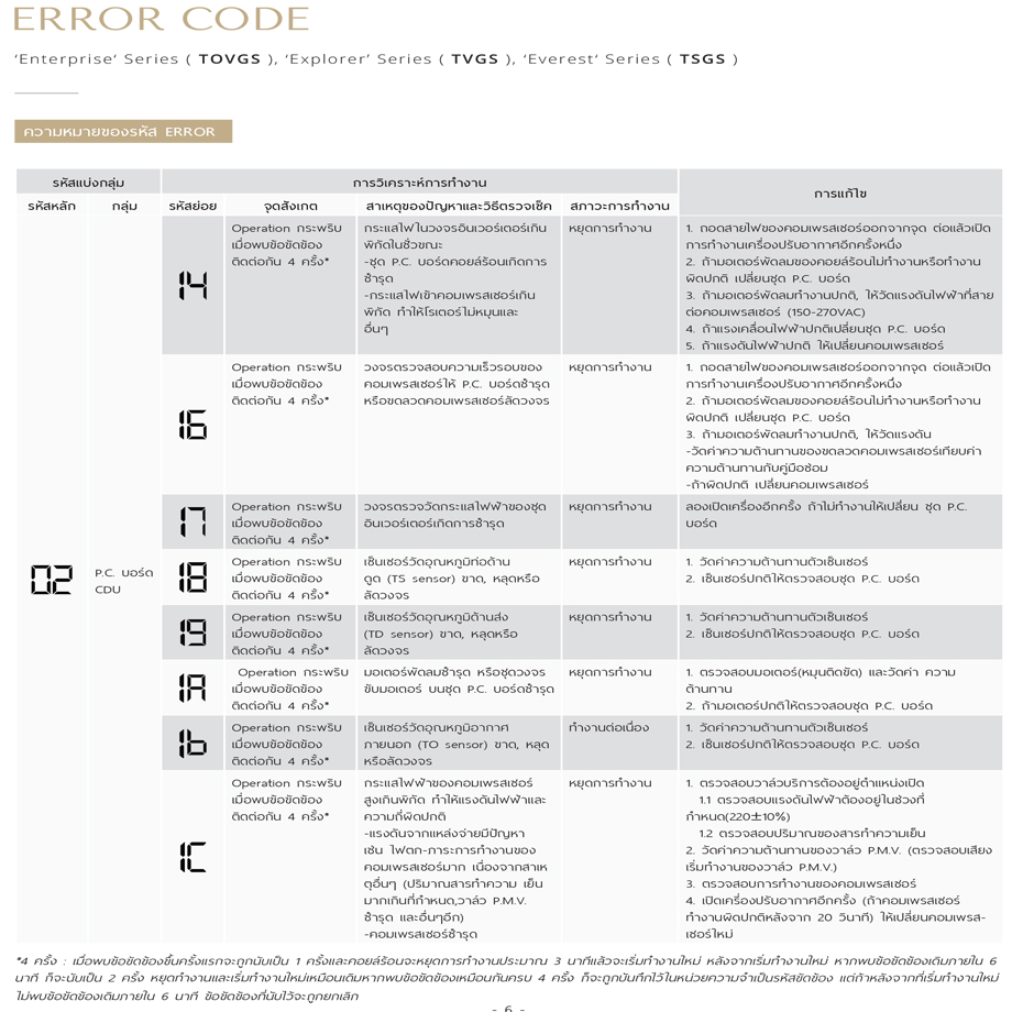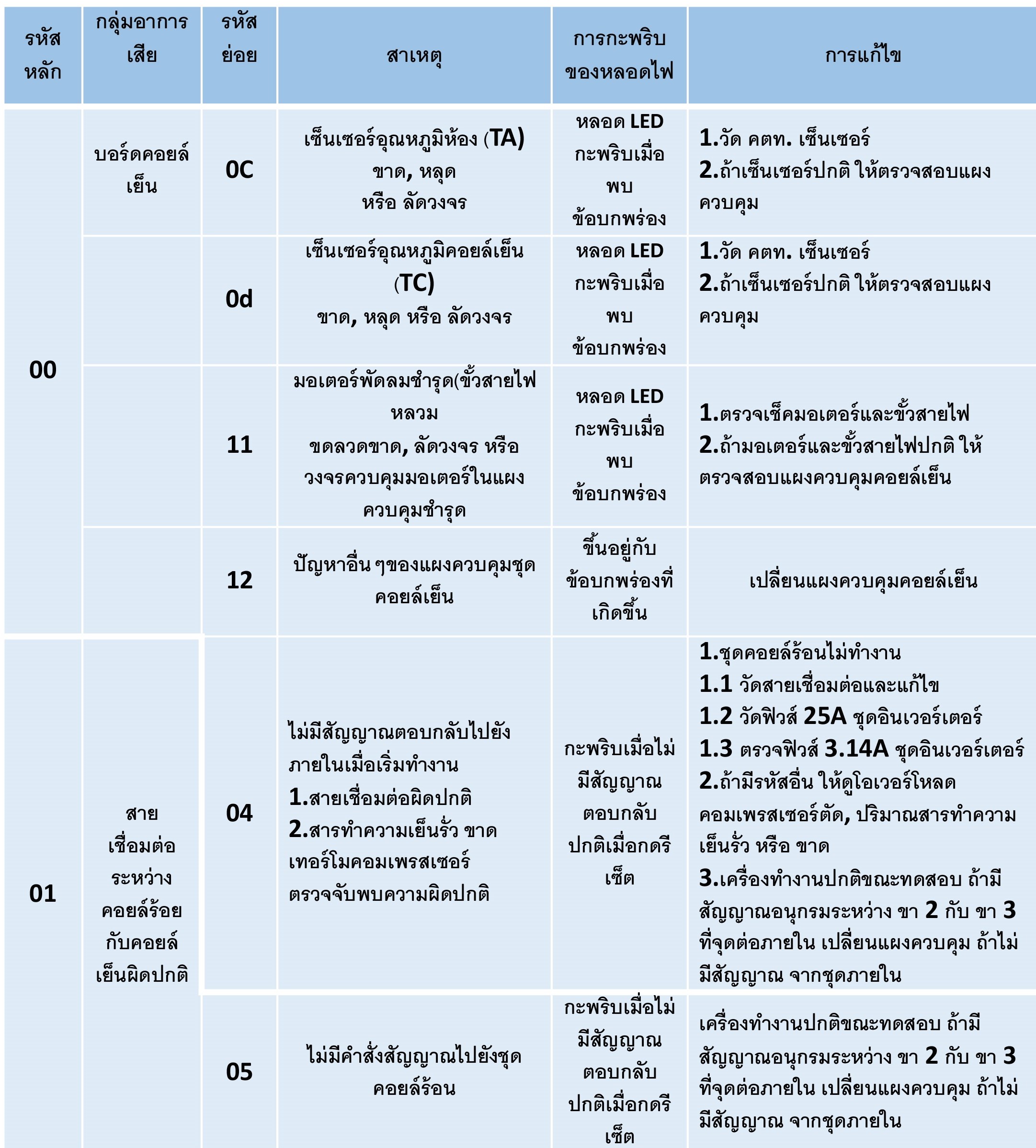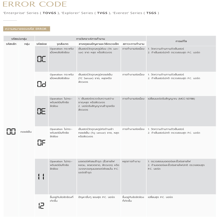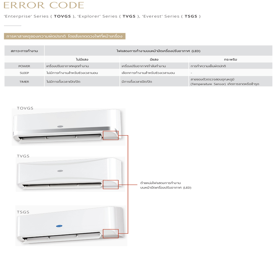Error Code Air คือรูปแบบสัญญาณไฟกนะพริบ รหัสตัวเลขหรือตัวอักษรที่บอกถึงอาการเสียและการทำงานที่ ผิดปกติของแอร์บ้าน เพื่อให้เราสามารถวิเคราะห์หาสาเหตุที่แท้จริงของอาการเสียได้ง่ายขึ้น แอร์บ้านแต่ละแบรนด์นั้นก็จะมี Error Code ที่แตกต่างกันออกไป ควรดูตามสเป็กและคู่มือให้ตรงตามแบรนด์นั้นๆด้วย ดังนั้นทางร้านขอรวบรวมเนื้อหา Error Code แอร์บ้าน แต่ละแบรนด์มาไว้ในที่เดียวกันเพื่อง่ายและสะดวกแก่การค้านหายิ่งขึ้น